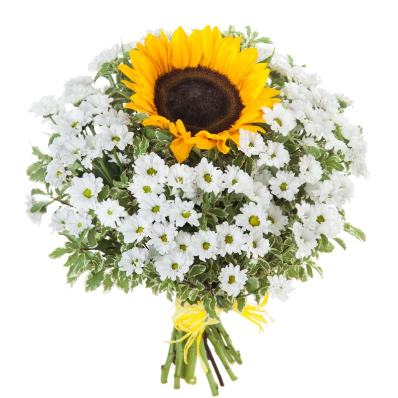 Букет состоит из 10 веток хризантем Сантини, 1 подсолнух, питтоспорум, прозрачная упаковка, атласная лента.