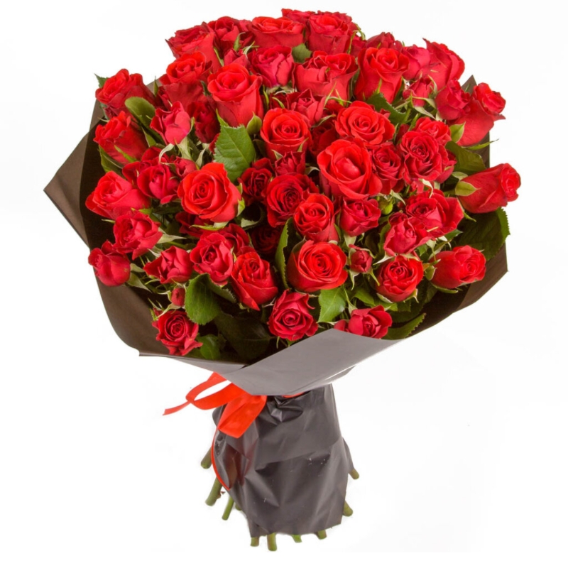 Букет состоит из 15 красных роз, 10 кустовых роз, крафт, атласная лента.