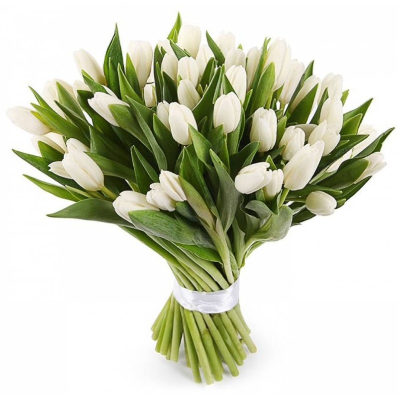 Букет состоит из 51 белый тюльпан, атласная лента.