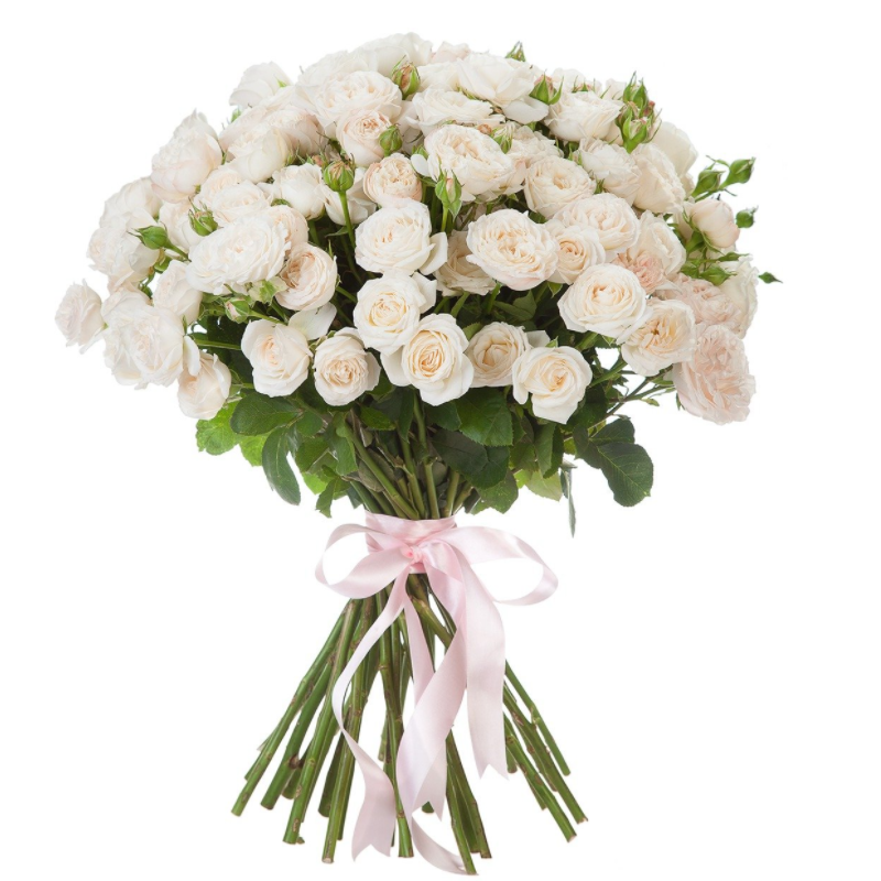 Букет состоит из 21 ветка белой кустовой розы, прозрачная упаковка, атласная лента.