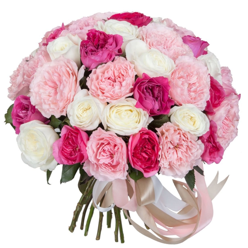 Букет состоит из MIX из 45 пионовидных роз, прозрачная упаковка, атласная лента.