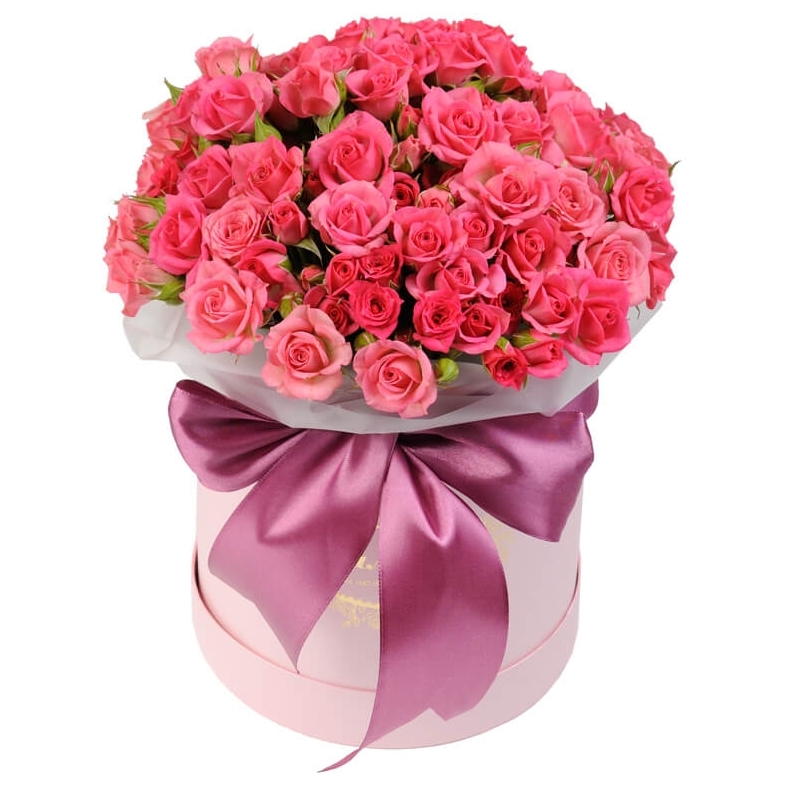 Букет состоит из 19 розовых кустовых роз, коробка, оазис, атласная лента.